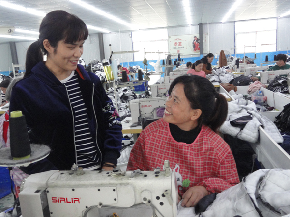 10月20日,商水縣黃寨鎮(zhèn)草樓村“返鄉(xiāng)創(chuàng)業(yè)標(biāo)兵”、鎮(zhèn)人大代表梁艷麗(左)向留守婦女李霞了解生產(chǎn)情況。5年前,梁艷麗和丈夫田新田從溫州打工返鄉(xiāng)后在鎮(zhèn)人大、工商聯(lián)和扶貧辦的幫助下投資200萬元創(chuàng)建巧姑制衣有限公司,下設(shè)3個制衣廠和1個扶貧車間,安排當(dāng)?shù)?00多名留守婦女和30名貧困戶婦女就業(yè)。