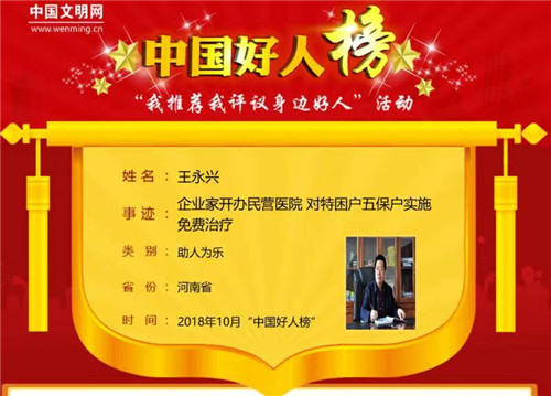 太康縣農(nóng)家出身的王永興熱心公益,累計(jì)投資高達(dá)數(shù)千萬元。10月31日上午,10月中國好人榜發(fā)布儀式暨全國道德模范與身邊好人現(xiàn)場(chǎng)交流活動(dòng)在江蘇連云港舉行,太康縣王永興榮登10月份助人為樂類“中國好人榜”。據(jù)悉,太康縣入選“中國好人榜”人數(shù)已達(dá)42人。
