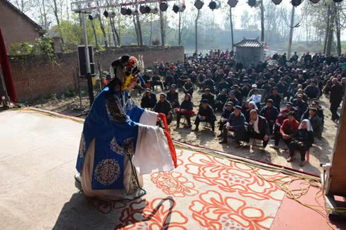 11月3日上午,記者在平店鄉(xiāng)吳吉屯村看到,剛剛落成的村室門前搭建了一個(gè)大舞臺(tái),洛陽市的一家豫劇團(tuán)正在表演精彩的古裝戲曲,舞臺(tái)前坐滿了村民(如圖)。