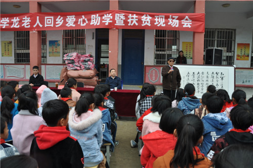 雖然身在北京,但于學(xué)龍老人的心始終牽掛著故鄉(xiāng)。11月5日,他回到老家商水縣黃寨鎮(zhèn),用自己的退休金,為母校埠口小學(xué)的孩子送來一批嶄新的書包和自己創(chuàng)作的書法精品。“親愛的小校友們,你們背上書包上學(xué)就更方便了,希望你們好好學(xué)習(xí)、茁壯成長,將來成為社會棟梁,報效國家?!庇趯W(xué)龍對孩子們說。