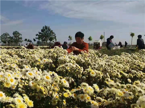 當(dāng)日,位于高集鄉(xiāng)北部的黨橋、雙堂等幾個(gè)行政村,也是熱鬧非凡。一臺臺大小不同的車輛,滿載著剛從地里摘下的鮮菊花,正往富甲一方菊花加工廠里銷售,縷縷的菊花清香隨風(fēng)飄來,煞是誘人。在富甲一方合作社帶動(dòng)下,今年有16戶貧困戶種植80多畝菊花,鄉(xiāng)政府對首次種植的貧困戶負(fù)責(zé)技術(shù)培訓(xùn),并給予每畝1000元的生產(chǎn)獎(jiǎng)補(bǔ)。今年菊花每公斤4元左右,麥茬種植菊花每畝可產(chǎn)鮮菊1100-1300公斤,去掉雇人摘菊花費(fèi)用每公斤0.3元,每畝可收入4000-5000元。種植菊花的貧困戶孫建國在富甲一方收購現(xiàn)場,正樂呵呵的數(shù)著賣菊花得來的大把鈔票。