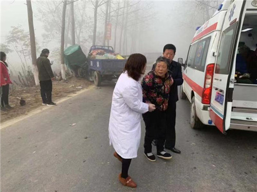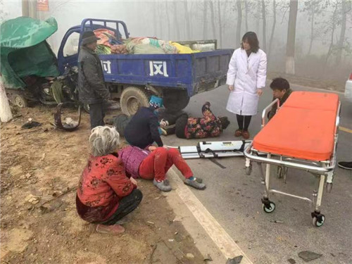 行至不遠(yuǎn)處,他們隱約發(fā)現(xiàn)前方有障礙物,并聽到有人呼救。王和平和同事立即下車走進(jìn)一看,只見一輛農(nóng)用三輪車和一輛電動(dòng)三輪車相撞,電動(dòng)三輪車被撞到路邊一顆樹上,整個(gè)車身被撞傾斜,事故現(xiàn)場有 4人東倒西歪地躺在地上,傷情不明。