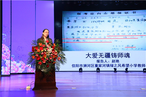 報(bào)告會(huì)上,李芳的同事綠之風(fēng)希望小學(xué)教師趙艷、李芳的老師信陽(yáng)職業(yè)技術(shù)學(xué)院語(yǔ)言傳媒學(xué)院教師熊可書、李芳的女兒代雨辰和信陽(yáng)市浉河區(qū)委宣傳部新聞中心記者劉亞迪分別以《大愛無疆鑄師魂》,《那是青春吐芳華》,《有媽媽的地方處處是溫暖》,《大別山上映山紅》為題,深情講述李芳同志一心想著學(xué)生,全身心投入教育工作,扎根鄉(xiāng)村獻(xiàn)身教育事業(yè)的點(diǎn)點(diǎn)滴滴,詮釋了李芳同志不忘初心、潛心育人、敬業(yè)奉獻(xiàn)、舍生忘我的高尚品德和優(yōu)秀品質(zhì),為與會(huì)者帶來了一場(chǎng)感人肺腑的報(bào)告會(huì)。