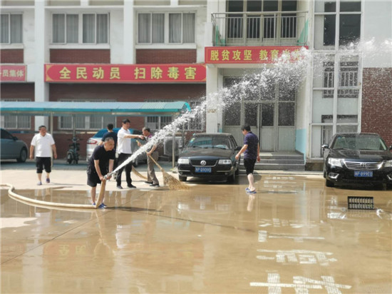 雖然天氣炎熱,大家汗流浹背,卻熱情高漲,積極性很高,大家紛紛拿起掃帚、抹布,提上水桶,充分發(fā)揚不怕臟、不怕累的精神,對院內(nèi)道路、車棚、宣傳欄、綠化帶等處進行沖洗、清掃,同時對各樓層門窗玻璃、消防栓、廁所等進行集中清理……經(jīng)過兩個多小時的辛勤勞動,各辦公室窗明幾凈,廁所衛(wèi)生干凈整潔,車棚車輛擺放整齊,院內(nèi)環(huán)境煥然一新。