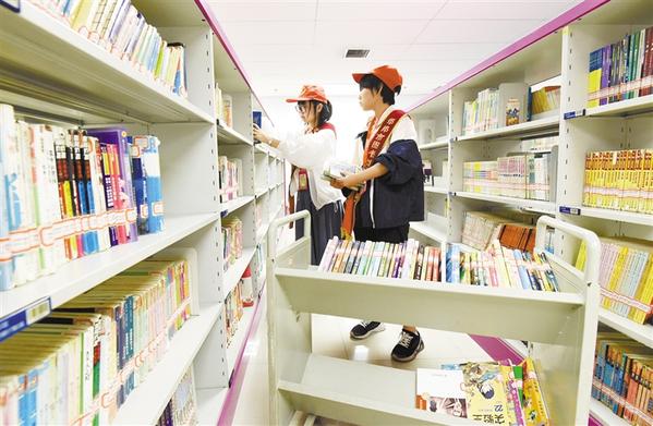 7月2日,在圖書館,參加“我當(dāng)小圖書管理員”社會(huì)實(shí)踐活動(dòng)的學(xué)生在整理圖書。
