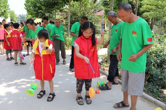 敬老院的老人們也不甘落后,孩子們表演結(jié)束后,老人們也向孩子們表演了拿手絕活——抖空竹。只見,小小的空竹在老人們手中忽高忽低、時快時慢,各種令人嘆為觀止的花樣動作,猶如行云流水、連綿不斷,引得孩子們齊聲叫好。學(xué)生們紛紛上前,從老人手里接過空竹,一邊討教一邊聯(lián)系,歡聲笑語不時在敬老院上空回蕩。