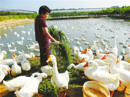 7月16日,沈丘縣周營鎮(zhèn)馬營村生態(tài)鵝養(yǎng)殖基地,工人正在喂養(yǎng)生態(tài)鵝。近年來,該鎮(zhèn)充分利用得天獨厚的生態(tài)環(huán)境優(yōu)勢,積極引導群眾發(fā)展訂單生態(tài)土雞、肉鵝、槐山羊等特色養(yǎng)殖產(chǎn)業(yè),全力促進農(nóng)民增收致富。謝辛凌 攝