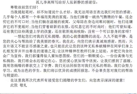 為表示對(duì)張新靜等人大代表的感謝,隨后,李高輝給張新靜寫了一封感謝信。信中,他表示,自己一定不辜負(fù)大家的期望,以后會(huì)更加努力學(xué)習(xí),回饋社會(huì),回報(bào)大家?!八且粋€(gè)懂得感恩的孩子,讀了他的來(lái)信,我感到很欣慰。”張新靜說(shuō)。
