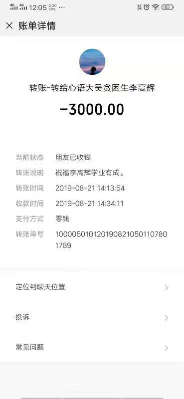 “今后,在學(xué)習(xí)和生活上無(wú)論遇到什么困難,只管給我們說(shuō),我們會(huì)隨時(shí)幫助你解決?!睆埿蚂o在與李高輝聊天中再三叮囑李高輝說(shuō)。隨后,他通過(guò)微信給李高輝轉(zhuǎn)來(lái)3000元學(xué)費(fèi)。