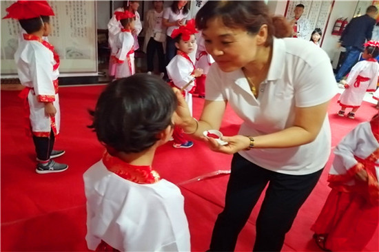 活動包含“朱砂開智”、誦讀《弟子規(guī)》、“擊鼓明志”、書畫展示、感恩五個環(huán)節(jié):第一個環(huán)節(jié)老師為孩子“朱砂開智”。用朱砂為剛剛?cè)雽W(xué)的孩子在額頭正中點(diǎn)上紅痣,又稱之為“開天眼”。寓意著孩子從此心明眼亮,好讀書、讀好書。第二個環(huán)節(jié)老師帶領(lǐng)大家誦讀《弟子規(guī)》。孩子們在老師及社區(qū)工作人員帶領(lǐng)下誦讀國學(xué)經(jīng)典《弟子規(guī)》,一起感受儒家經(jīng)典的道德教化魅力。第三個環(huán)節(jié)是“擊鼓明志”。擊鼓明志是結(jié)合中國傳統(tǒng)文化,讓孩子們通過擊打中國鼓,以鼓聲的清脆悅耳,來提高孩子的精氣神,激發(fā)孩子們的斗志,給孩子們建立濟(jì)世救人,胸懷天下的抱負(fù),從而也讓孩子們表達(dá)出人生理想,為未來的人生目標(biāo)努力奮斗?!拔议L大想當(dāng)一名醫(yī)生,可以治病救人……我長大想當(dāng)一名消防員,在著火的時候奔赴火場救人……我長大想當(dāng)一名古箏老師,登上世界舞臺彈奏好聽的音樂……”孩子們依次擊鼓并說出了人生理想抱負(fù)。第四個環(huán)節(jié)是書畫展示。繪畫創(chuàng)作讓孩子們靜定心靈,激發(fā)智慧。第五個環(huán)節(jié)是感恩環(huán)節(jié),感恩老師、感恩父母、感恩天地萬物,以此培養(yǎng)孩子們向善向上的健康思想,增強(qiáng)他們的社會責(zé)任感,進(jìn)一步引導(dǎo)他們常懷感恩之心。