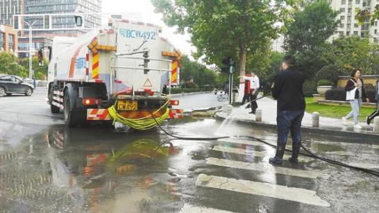 10月20日,中心城區(qū)慶豐路與周口大道交叉口處,市城鄉(xiāng)一體化示范區(qū)工作人員正在清洗路面。近日,我市有關(guān)部門抽調(diào)人力清洗路面,美化環(huán)境,城市變美了,市容變靚了。