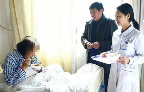 餃子煮好,盛入碗內(nèi),端入病房,親手送到患者手中,看到患者品嘗餃子時(shí)的開心樣子,醫(yī)護(hù)人員從心里笑到了臉上。