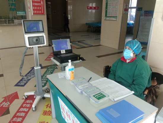 2月18日,記者在周口市中心醫(yī)院急診科看到,一臺醫(yī)用紅外熱像儀出現(xiàn)在急診科的大門口,前來就診的患者必須通過該熱像儀的檢測才能進入急診科就診?!扒皝砭驮\的患者只需要在熱像儀前經(jīng)過,熱像儀就會在屏幕上自動顯示患者的體溫信息,一旦出現(xiàn)體溫偏高的人,熱像儀就會自動報警,并不需要人工檢測,提高了檢測效率?!痹谠摕嵯駜x前做紀錄的醫(yī)務工作者說。 記者 張洪濤 攝