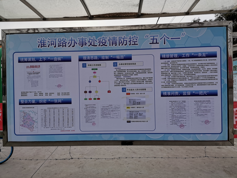 淮河路辦事處地處我市東南部,總?cè)丝诩s4萬。轄區(qū)黃灘、孟營、鄭洼、牛灘、劉新莊、姚灘、南徐、路莊、趙寨、麥仁店、康樓、徐莊等12個(gè)居委會(huì),有34個(gè)自然村,114個(gè)村民組,人口約39000人、面積20平方公里。根據(jù)轄區(qū)的實(shí)疫情防控工作,淮河路辦事處探索出一套疫情防控工作“五個(gè)一”流程。統(tǒng)籌謀劃,上下“一盤棋”; 整合力量,織密“一張網(wǎng)”; 理清思路,繪制“一幅圖”;精細(xì)管理,工作“一條龍”;精準(zhǔn)問責(zé),監(jiān)督“一把尺”。