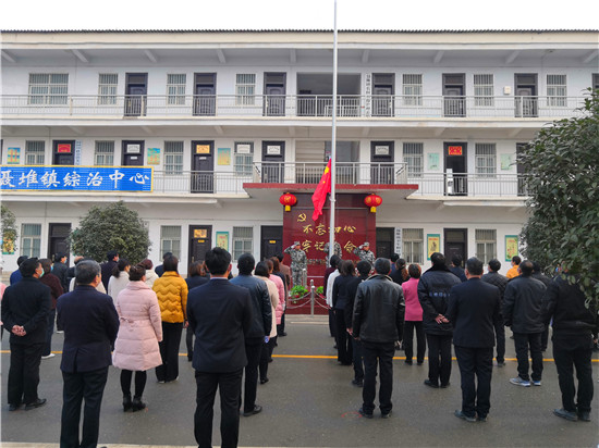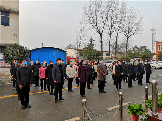 按照疫情防控復產(chǎn)復工工作安排,2月24日為恢復上班的第一天。8時許,西華縣聶堆鎮(zhèn)政府全體干部衣冠莊重、佩戴口罩、按照間隔1.5米的距離整齊地站在國旗臺前共同舉行隆重的升國旗儀式,以一種不一樣的方式打開新的工作局面。