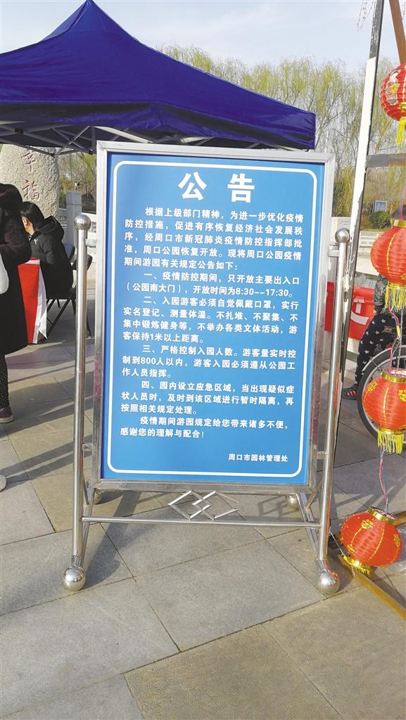 當(dāng)日上午10時許,記者在周口公園看到,在南門入口處的醒目位置,擺放著一個公告牌,寫有入園須知,上面顯示疫情防控期間的開園時間為8:30~17:30,不少游客駐足觀看。入口處,周口市園林管理處疫情防控宣傳臺前的工作人員正忙碌著。游客需間隔1米距離排隊(duì),經(jīng)測量體溫、登記身份證號、雙手噴灑酒精后方可進(jìn)園。雖然入園程序有點(diǎn)繁瑣,但是游客都非常配合。