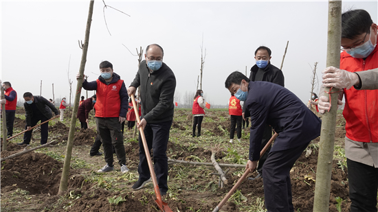 在義務植樹活動現(xiàn)場,參加植樹的縣領導率先垂范,紛紛拿起植樹工具,種下了一棵棵樹種,為初春的鄲城大地增添新綠。在縣領導的帶領下,參加植樹的志愿者們也紛紛行動起來,大家兩人一伙,三人一群,揮鍬培土、正苗踩實,道道工序細致認真、有條不紊。放眼望去,一排排新栽下的樹種整齊排列、迎風而立,展現(xiàn)一片蓬勃生機。