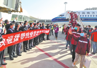 “英雄,英雄,你們最棒!”“白衣天使,歡迎回家!”3月19日16點(diǎn)左右,鄭州國際機(jī)場269停機(jī)坪響起熱烈的歡迎聲音,支援湖北的鄭州大學(xué)第一附屬醫(yī)院國家緊急醫(yī)學(xué)救援隊(duì)隊(duì)員和鄭州市直醫(yī)院的醫(yī)療隊(duì)隊(duì)員一起乘坐南航包機(jī)平安到家了。在接下來的一個(gè)小時(shí)里,又有兩架搭載支援湖北醫(yī)療隊(duì)隊(duì)員的南航包機(jī)相繼降落。至此,當(dāng)天共有453名河南抗疫勇士從武漢返家。