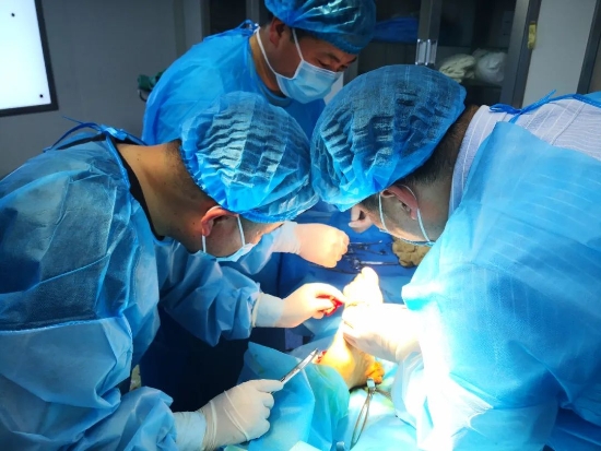 患者,張某,男,64歲,巴集鄉(xiāng)曹集行政村人。因下肢開放足損傷,到巴集鄉(xiāng)衛(wèi)生院就診。由于患者年紀(jì)大、病情急,巴集鄉(xiāng)衛(wèi)生院人員技術(shù)能力有限,接診醫(yī)師告知需到縣級(jí)醫(yī)院進(jìn)行手術(shù)?;颊呒覍僬f家庭困難,各項(xiàng)開支大,請(qǐng)求能不能讓專家到下面開展手術(shù)。接診醫(yī)師報(bào)醫(yī)共體辦公室聯(lián)系集團(tuán)總院,集團(tuán)總院立即組織幫扶專家團(tuán)隊(duì)。晚9點(diǎn),以集團(tuán)總院副院長于祖河、骨科主治醫(yī)師王鑫和巴集鄉(xiāng)衛(wèi)生院外科主任楊志遠(yuǎn)、外科副主任王山嶺的協(xié)助下,成功地為張某行肌腱吻合、神經(jīng)探查、趾骨骨折內(nèi)固定術(shù)。目前,患者生命體征平穩(wěn),恢復(fù)良好。