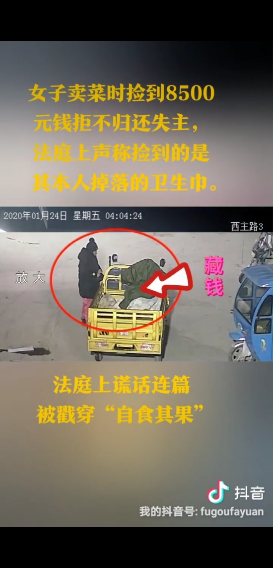 庭審中,面對監(jiān)控錄像顯示楊某彎腰撿拾錢款的畫面,楊某本人百般抵賴、謊話連篇,拒不承認撿到錢款。當法官詢問楊某如何解釋監(jiān)控畫面中顯示其撿到了白色包裹時,楊某居然說是彎腰撿東西了,但撿的不是錢,撿的是她自己的衛(wèi)生巾。法官再次向楊某告知當事人作虛假陳述的后果及應當承擔的法律責任,楊某仍一口咬定撿到的不是錢,撿的是衛(wèi)生巾。法官遂傳喚現(xiàn)場目擊證人出庭作證,兩名證人依法進行了法庭宣誓,明確表示見到了楊某撿起地上一包錢并放入其本人包中的行為。此時,原告又提交了一份錄音證據(jù),法官予以當庭播放。錄音清晰顯示,楊某在電話中曾經(jīng)承認1月24日早上撿到錢款的行為。