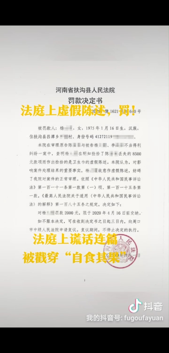 為了將撿到的8500元錢據(jù)為己有,當事人竟然在法庭上作出虛假陳述,最終不僅被法官當庭識破,全額返還失主,還被法院處以2000元罰款,真可謂得不償失、自食苦果。近日,針對被告楊某的虛假陳述行為,扶溝縣人民法院呂潭法庭依法作出罰款2000元的處罰決定,楊某在規(guī)定時間內繳清了罰款。