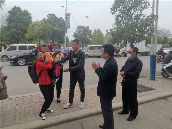 鄲城縣婦幼保健院院長亢國良帶領副院長羅素霞、護理部主任王翠蘭,到隔離點迎接該院援鄂英雄丁錕回家,為英雄送去鮮花,并全程護送丁錕安全返回家中。