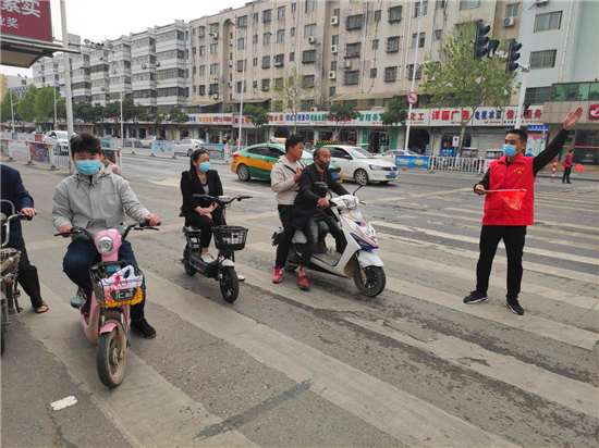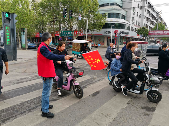活動(dòng)中,機(jī)關(guān)、社區(qū)十余名志愿者穿著紅馬甲,手持小紅旗到交通路與五一路、六一路交叉口開(kāi)展文明交通勸導(dǎo)。志愿者們對(duì)部分市民闖紅燈、亂穿馬路、騎電動(dòng)車(chē)打電話(huà)等不安全的交通行為進(jìn)行勸阻,耐心引導(dǎo)行人和非機(jī)動(dòng)車(chē)輛遵守交通規(guī)則,并協(xié)助交警維持十字路口交通秩序。