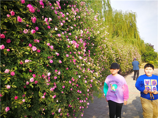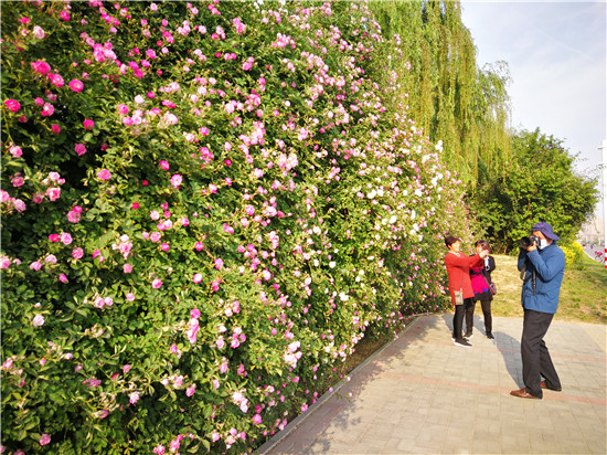 4月23日,市民從繁花滿枝狀如“瀑布”的刺玫花下走過(guò)。市體育館西南角的刺玫花正在熱烈綻放,團(tuán)團(tuán)簇簇綴滿枝頭,遠(yuǎn)遠(yuǎn)望去,宛如彩色的“瀑布”一瀉而下。不少市民在花墻前拍照、玩耍,成為市民們“打卡”地。