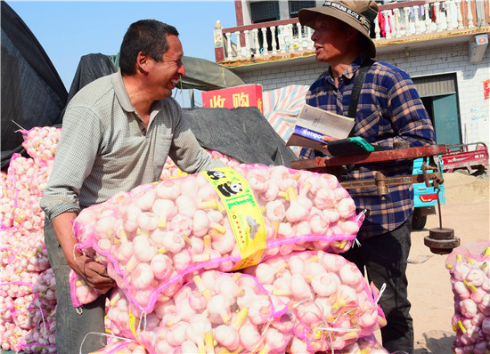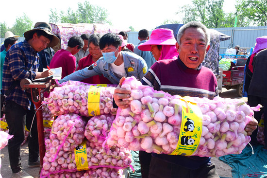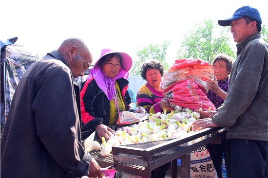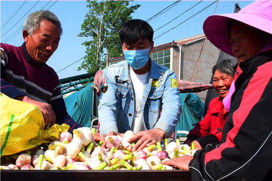 4月26日下午,記者在淮陽(yáng)縣王店鄉(xiāng)107國(guó)道沿線看到,各個(gè)大蒜的收購(gòu)點(diǎn)車(chē)來(lái)車(chē)往,蒜農(nóng)們拉著新蒜賣(mài)給小販們。盡管今年春季雨水較少,天旱土地墑情較差,但是上萬(wàn)畝大蒜,在蒜農(nóng)們施肥澆水管理下,長(zhǎng)勢(shì)不錯(cuò),每畝產(chǎn)量在3000斤到4000斤之間,迎來(lái)疫情下的大蒜豐收。