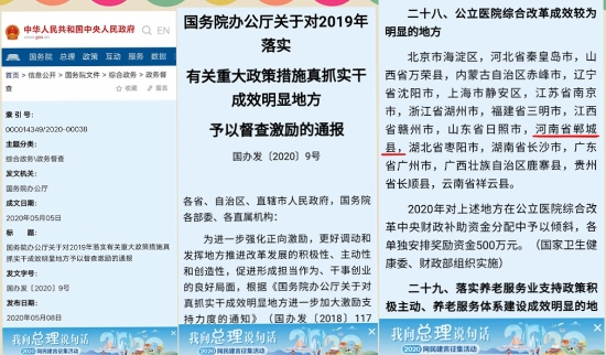 5月8日,中華人民共和國中央人民政府門戶網(wǎng)站發(fā)布《國務(wù)院辦公廳關(guān)于對2019年落實有關(guān)重大政策措施真抓實干成效明顯地方予以督查激勵的通報》國辦發(fā)〔2020〕9號文件,對213個地方予以督查激勵,相應(yīng)采取30項獎勵支持措施。其中,鄲城縣榮登“對公立醫(yī)院綜合改革成效較為明顯的地方”名錄,獲獎500萬元。