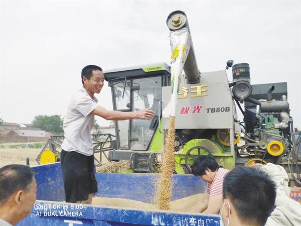 日前,我市小麥相繼進(jìn)入成熟期,田地里一片金黃,滾滾麥浪中收割機(jī)來回穿梭,農(nóng)民已經(jīng)開始收麥了。圖為5月24日上午,沈丘縣李老莊鄉(xiāng)部分麥子開始收割,飽滿的麥粒從收割機(jī)中流出,農(nóng)民的臉上綻放出笑容。