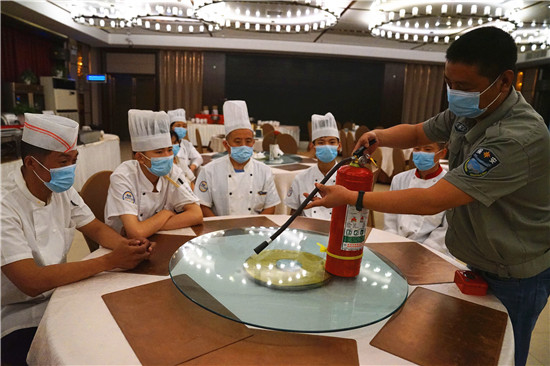 夏季來臨,消防安全成為大家關注的焦點,為了消除隱患,防止安全事故發(fā)生,6月3日,周口飯店精心組織管理人員和員工開展消防應急演練,提升消防應急處置能力,預防各種事故發(fā)生。當天,來自該飯店餐飲部及客房部40余名工作人員參加了演練。(記者 金月全 攝)