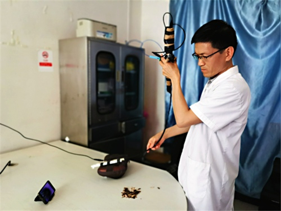 “這是氣管鏡,這是顯示屏,這是氣管,這是模擬人的胸部。”6月5日上午,在市婦幼保健院南院區(qū)兒科診室內,該科醫(yī)生徐公彥拿著自制的模擬呼吸內鏡向記者演示。