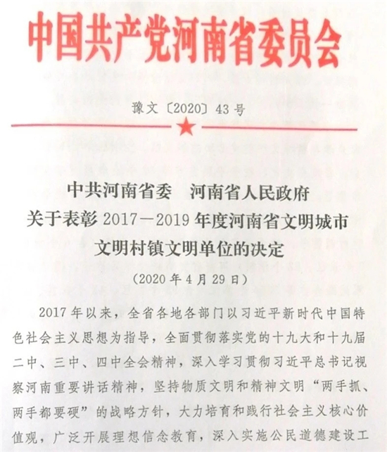 近日,省委、省政府下發(fā)《關(guān)于表彰2017—2019年度河南省文明城市文明村鎮(zhèn)文明單位的決定》(豫文〔2020〕43號),鄲城縣婦幼保健院名列其中,榮獲“河南省文明單位”榮譽(yù)稱號。這是我院自1987年首次被授予“河南省文明單位”稱號以來,連續(xù)第33年保持這項(xiàng)榮譽(yù)。