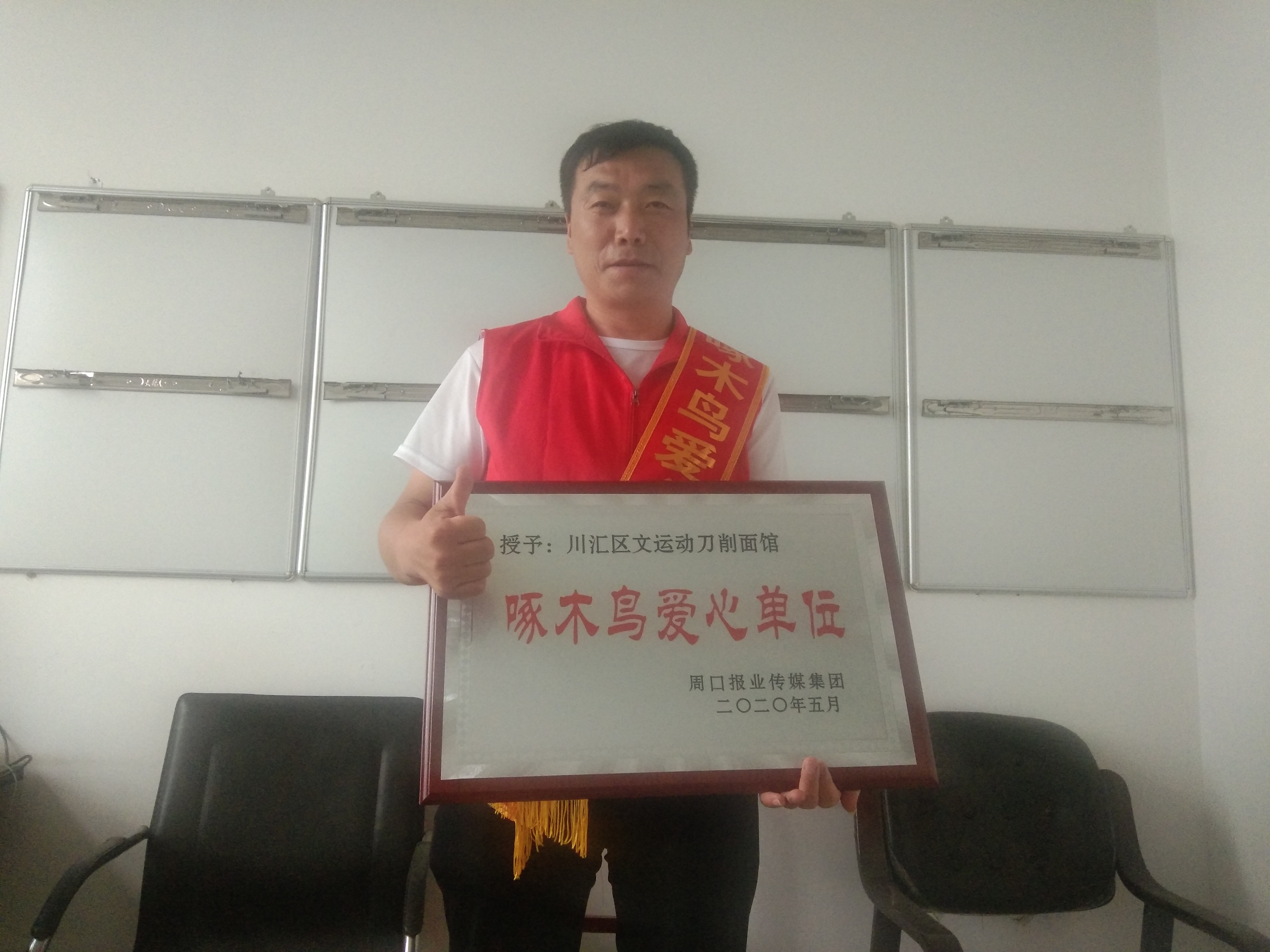 6月15日下午,周口報業(yè)傳媒集團14樓會議室內,熱鬧非凡,10名優(yōu)秀啄木鳥志愿者和10家啄木鳥愛心單位被隆重表彰,他們一個個身披綬帶,上臺領獎,臉龐洋溢著自信而美麗的笑容。而文運動經營的“川匯區(qū)文運動刀削面館”被評為啄木鳥愛心單位,這無疑是對他多年來堅持參加公益事業(yè)的褒獎。
