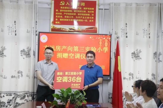 “方遠(yuǎn)房地產(chǎn)公司為第三實(shí)驗(yàn)小學(xué)捐贈(zèng)空調(diào),大大改善學(xué)校的降溫條件,為孩子們營(yíng)造更為舒適的學(xué)習(xí)環(huán)境?!钡谌龑?shí)驗(yàn)小學(xué)校長(zhǎng)王玉剛表示,學(xué)校將以此為契機(jī),號(hào)召?gòu)V大學(xué)生好好學(xué)習(xí),長(zhǎng)大后回報(bào)社會(huì);全校教職員工以?xún)?yōu)異的教學(xué)業(yè)績(jī)回報(bào)社會(huì),傳遞愛(ài)心,努力辦學(xué)生快樂(lè)、教師幸福、家長(zhǎng)滿意的現(xiàn)代化學(xué)校。