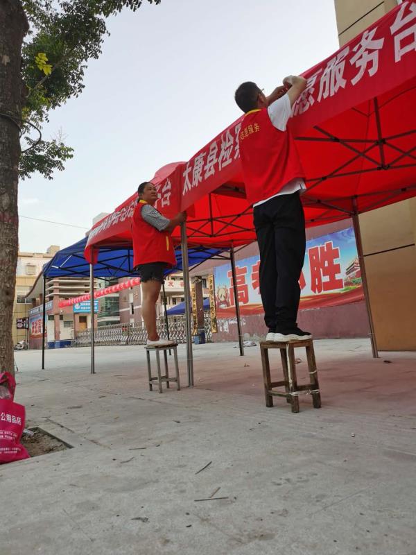 6日下午3時許,鄭雪艷和王作宇二人被安排到太康縣華夏外國語高考考點負責為考生和家長搭建11個茶水棚?!跋挛?點正是一天中最熱的時候,考點附近也沒有樹蔭?!碧悼h網信辦副主任高一麟回憶說,要在天黑之前搭建好11個茶水棚,對于鄭雪艷和王作宇兩人來說并非易事。