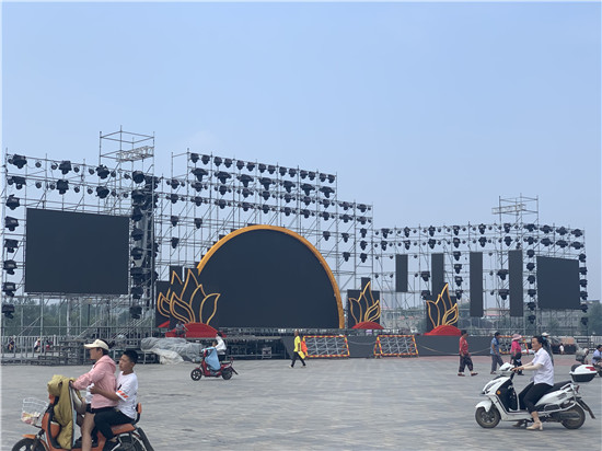 淮陽荷花節(jié)開幕式舞臺在太昊陵廣場廣場造型完工。據(jù)悉,2020年7月10日晚8點(diǎn)在此開幕,同時在舞臺東側(cè)的龍湖上將上演全息水幕燈光秀。