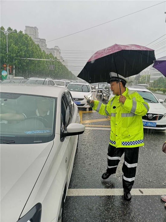 大雨滂沱,交通擁堵。7月22日,針對市區(qū)降大雨且部分路段出現(xiàn)嚴重積水的情況,交警及時啟動惡劣天氣應(yīng)急預(yù)案,迅速投入到工作中。