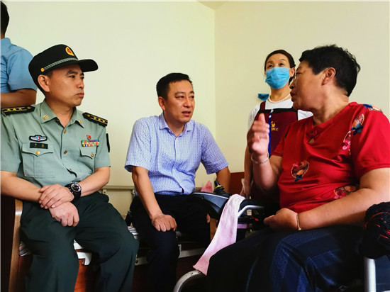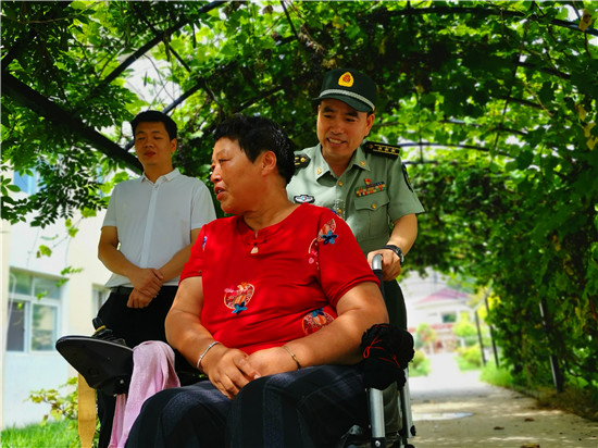 走進(jìn)位于太昊路上的周口市老年護(hù)理院,院內(nèi)整潔有序、花蕊吐香鳥鳴聲聲,小徑通幽處的涼亭內(nèi)三五老人打牌、聊天,一副愜意安詳?shù)纳顖鼍?。在侯國領(lǐng)母親王玉勤居住的房間內(nèi),李揚(yáng)、孫光濤等人坐在床邊與她聊天談心,看到這么多人來慰問她,王玉勤眼中流下了感動的眼淚,她對慰問人員表示感謝,說自己來護(hù)理院近一年來,吃住條件都不錯,護(hù)理院照顧的無微不至,身體一天天恢復(fù),閑暇時還能不依賴輪椅自己走上一段路。她激動地說:“感謝黨和政府的親切關(guān)懷,我最大的愿望是希望倆兒子永遠(yuǎn)聽黨的話,在部隊(duì)安心服役、再立新功,用優(yōu)異的成績回報黨和政府對我們?nèi)业年P(guān)愛?!?/p>