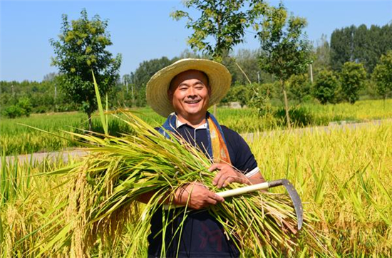 光山縣文殊鄉(xiāng)東岳村,四方景家庭農(nóng)場(chǎng)黨支部書記楊長太家的稻子喜獲豐收,并給我們?cè)V說著村里這一年的新變化。劉宏冰 攝