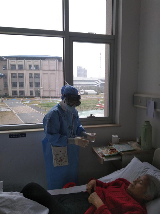 這位老人名叫楊守振,今年84歲,不僅感染新冠肺炎,而且有嚴(yán)重的營養(yǎng)不良,插著胃管,身體極為消瘦,生活不能自理。為了不讓老人出現(xiàn)壓瘡,胡奔奔需要每隔一個小時為老人翻一次身。翻身時候,為了讓老人更舒服一點,她每次都像抱孩子一樣把老人抱在懷里,動作輕柔的按摩老人受壓的部位防止壓瘡的形成。貼心照顧之下,老人身體狀況和精神逐漸好轉(zhuǎn),每次跟家人視頻聊天的時候,老人都會指著幫她舉著手機的胡奔奔朝手機里的家人顫顫巍巍的豎起大拇指。