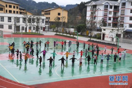 重慶市石柱土家族自治縣中益鄉(xiāng)小學(xué)的同學(xué)們在老師的帶領(lǐng)下練習(xí)擺手舞(2020年1月10日攝)。 新華社記者 王全超 攝