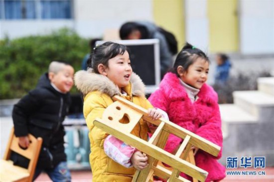 重慶市石柱土家族自治縣中益鄉(xiāng)小學(xué)的同學(xué)們搬著小椅子前往操場觀看文藝表演。當(dāng)日,“我的中國夢——文化進(jìn)萬家”中國視協(xié)文藝志愿服務(wù)小分隊走進(jìn)中益鄉(xiāng)小學(xué),為師生們帶來精彩的文藝表演(2019年12月12日攝)。新華社記者王全超 攝