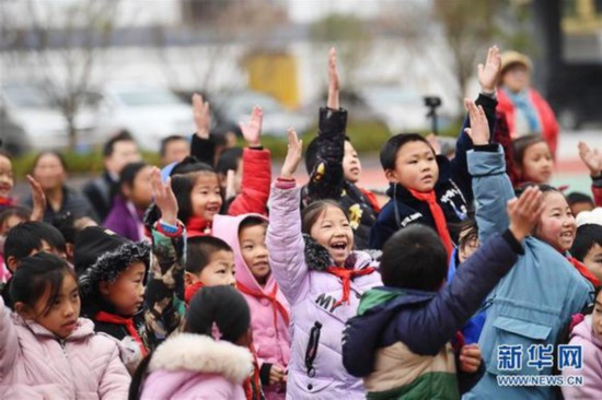 重慶市石柱土家族自治縣中益鄉(xiāng)小學(xué)的同學(xué)們在文藝演出現(xiàn)場與演員互動。當(dāng)日,“我的中國夢——文化進(jìn)萬家”中國視協(xié)文藝志愿服務(wù)小分隊走進(jìn)中益鄉(xiāng)小學(xué),為師生們帶來精彩的文藝表演(2019年12月12日攝)。新華社記者王全超 攝