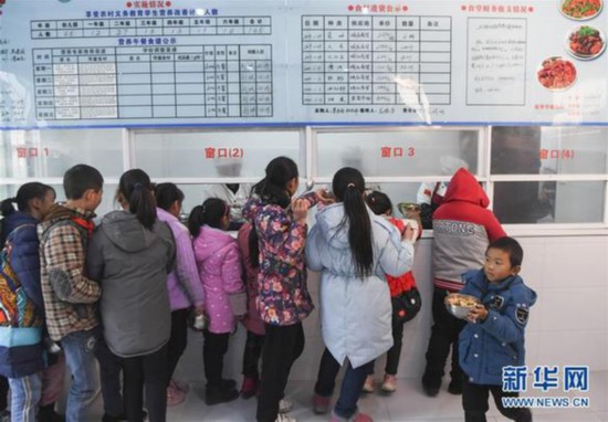 重慶市石柱土家族自治縣中益鄉(xiāng)小學(xué)學(xué)生在食堂排隊打飯菜(2020年1月10日攝)。 新華社記者 王全超 攝