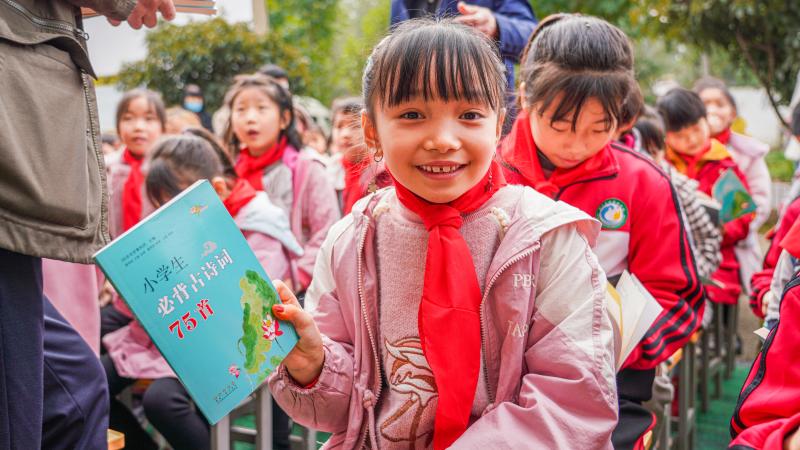 在看到擺在面前的幾百本書籍時,孩子們的眼睛更亮了。散發(fā)著油墨清香的一本本新書遞到了孩子們手中,有經(jīng)典名著、古文詩詞,還有寓言故事、科普傳記等等。興奮地翻閱著手中的書籍,孩子們不由自主地念出聲來:“繁星閃爍著,深藍(lán)的太空,何曾聽得見他們對語,沉默中,微光里,他們深深的互相頌贊了……”優(yōu)美的詩句撫慰著孩子們的心靈,滋養(yǎng)著他們的精神世界。