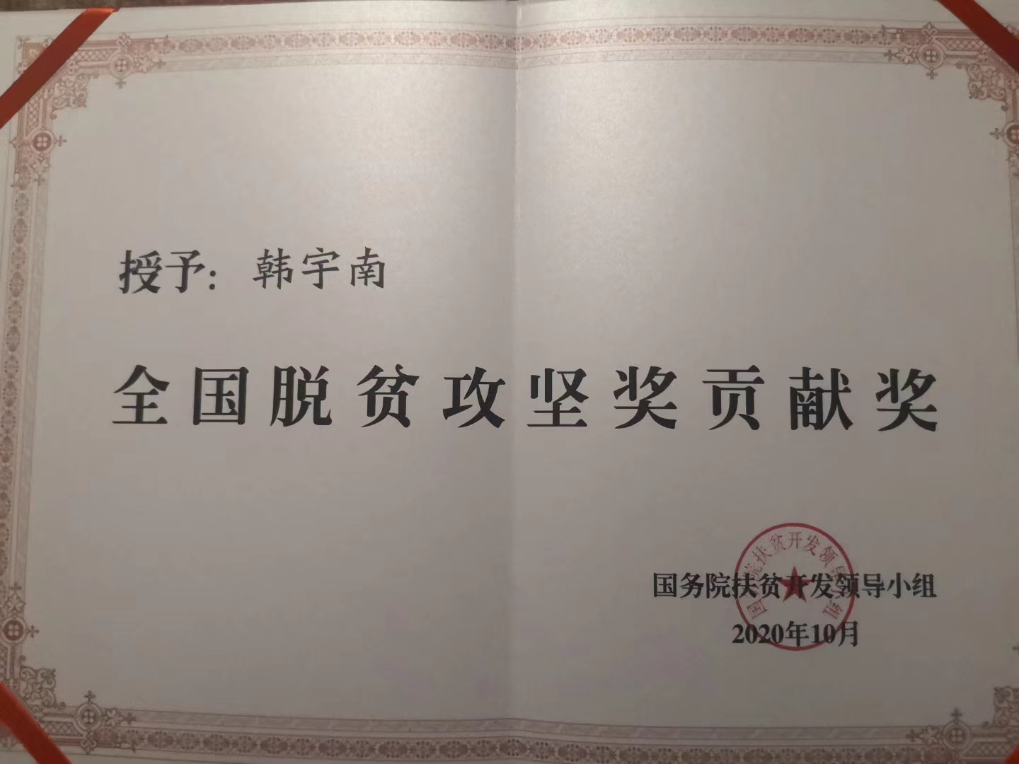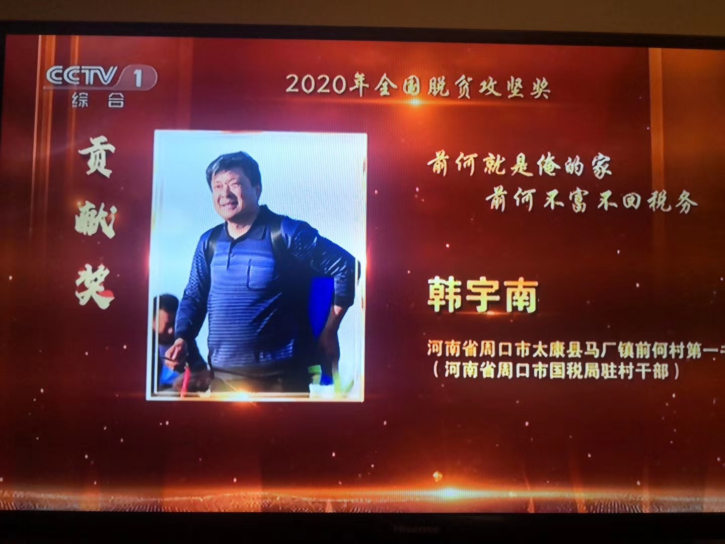 10月17日,2020年全國脫貧攻堅(jiān)獎(jiǎng)表彰大會(huì)暨首場脫貧攻堅(jiān)先進(jìn)事跡報(bào)告會(huì)在北京舉行。當(dāng)天,國務(wù)院扶貧開發(fā)領(lǐng)導(dǎo)小組辦公室官網(wǎng)發(fā)布了關(guān)于表彰2020年全國脫貧攻堅(jiān)獎(jiǎng)的決定,太康縣馬廠鎮(zhèn)前何村第一書記韓宇南榮獲全國脫貧攻堅(jiān)貢獻(xiàn)獎(jiǎng)。