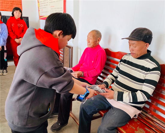 當(dāng)日9時(shí),學(xué)校各中隊(duì)隊(duì)員在校門口準(zhǔn)時(shí)集合,在校領(lǐng)導(dǎo)和大隊(duì)輔導(dǎo)員的帶領(lǐng)下,來(lái)到鎮(zhèn)敬老院。在敬老院里,孩子們認(rèn)認(rèn)真真清掃落葉和垃圾,為老人們晾曬被褥、衣物,擦洗用具,陪老人們聊天,還為每位老人贈(zèng)送了一雙“愛(ài)心棉手套”。老人們看著一張張青春陽(yáng)光的笑臉和一雙雙忙碌不停的小手,心里充滿溫暖和感激。