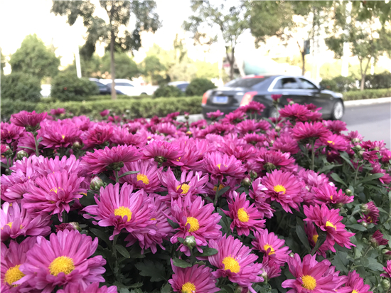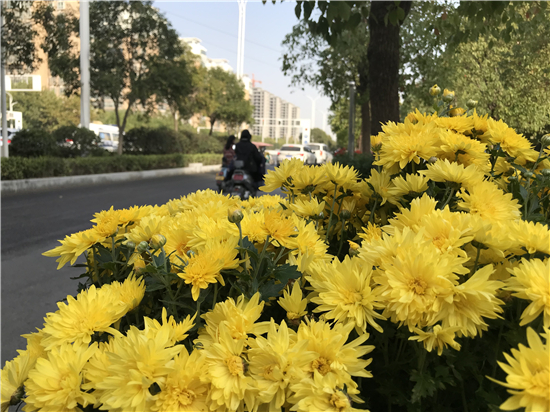 10月23日,霜降時節(jié),百花早已在寒風中凋零,而菊花卻傲骨迎風怒放。在周口大道與慶豐東路交叉口,朵朵菊花在陽光的照耀下,顯得清淡高雅、卓爾不凡,醉了清風、迷了行人。②8